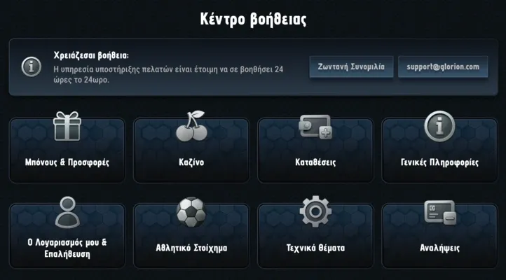 Επικοινωνήστε με την επαγγελματική ομάδα υποστήριξης του Glorion για βοήθεια σε οποιοδήποτε πρόβλημα σχετίζεται με τον λογαριασμό. Μπορείτε να χρησιμοποιήσετε τη λειτουργία Ζωντανής Συνομιλίας 24/7 για άμεσες απαντήσεις σε επείγοντα αιτήματα. Εναλλακτικά, στείλτε e-mail στη διεύθυνση υποστήριξης για πιο σύνθετα ζητήματα που απαιτούν λεπτομερή διερεύνηση.